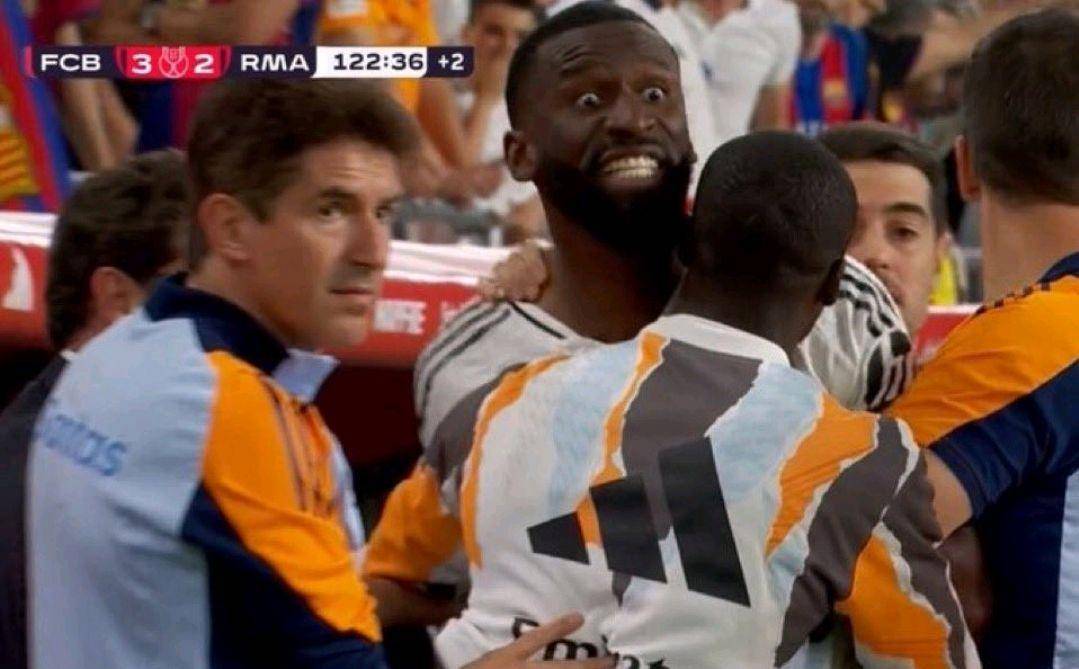 伯纳乌的夜晚本应属于冠军的狂欢,却因一位硬汉的失控演变成皇马更衣室的至暗时刻。在国王杯决赛加时赛第118分钟,当值主裁布尔戈斯一声哨响后,转播镜头捕捉到令人瞠目结舌的画面——替补席上的吕迪格突然暴起,抄起水瓶狠狠砸向场内,这个装满水的"愤怒炸弹"在草皮上炸开的水花,如同银河战舰本赛季卫冕之路突现的惊涛骇浪。